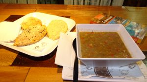 Délicieuse soupe de lentilles avec des empenadas aux poissons et légumes.