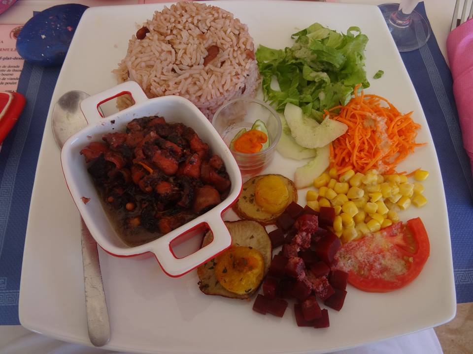 Commencez avant tout par des accras de morue en entrée. Si vous aimez la Langouste, le Ravet vous sera donc familier. Sa chaire est beaucoup plus fine (Un régal) Le Chatrou quant à lui est une petite pieuvre, cuit avec des épices en ragout, comme on s’est si bien le faire en Guadeloupe. Prenez l’accompagnement de votre choix, le plus souvent avec une salade, en plus du riz et haricots rouges.