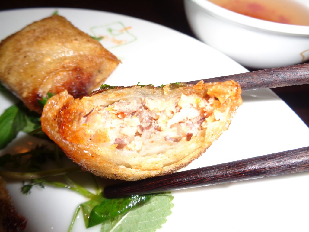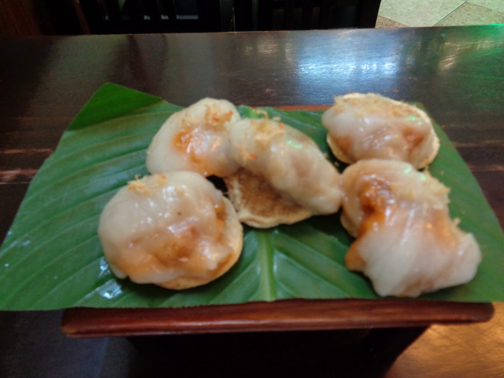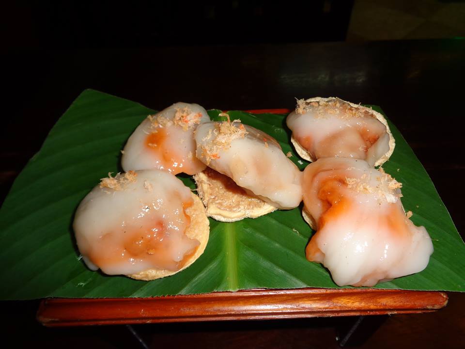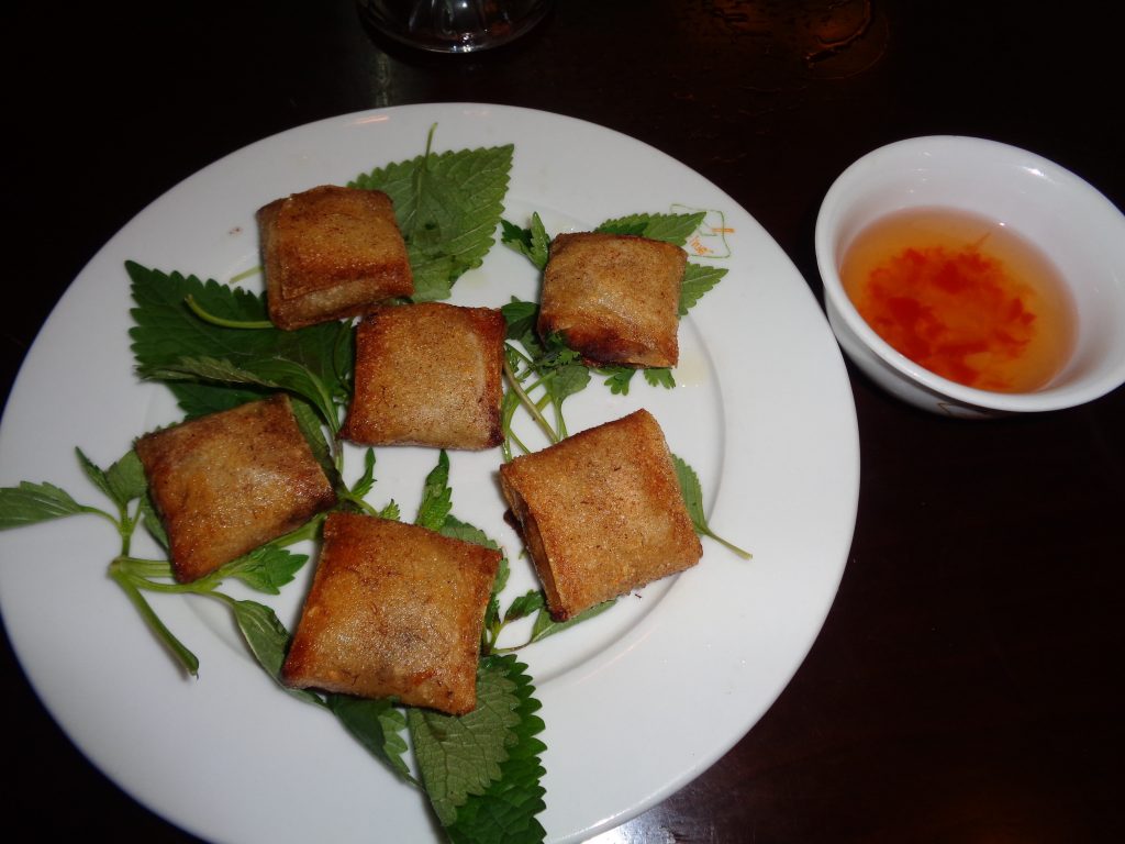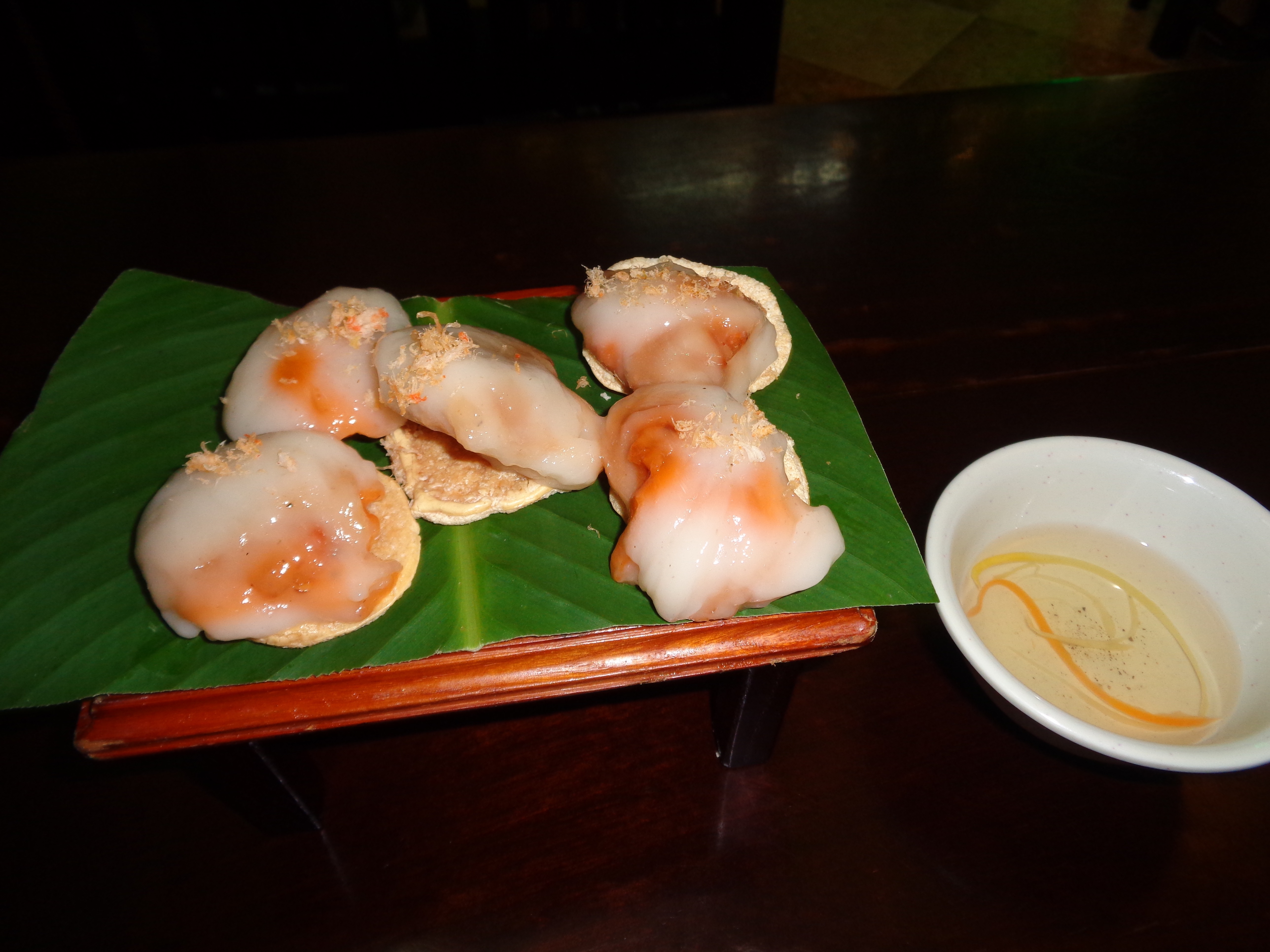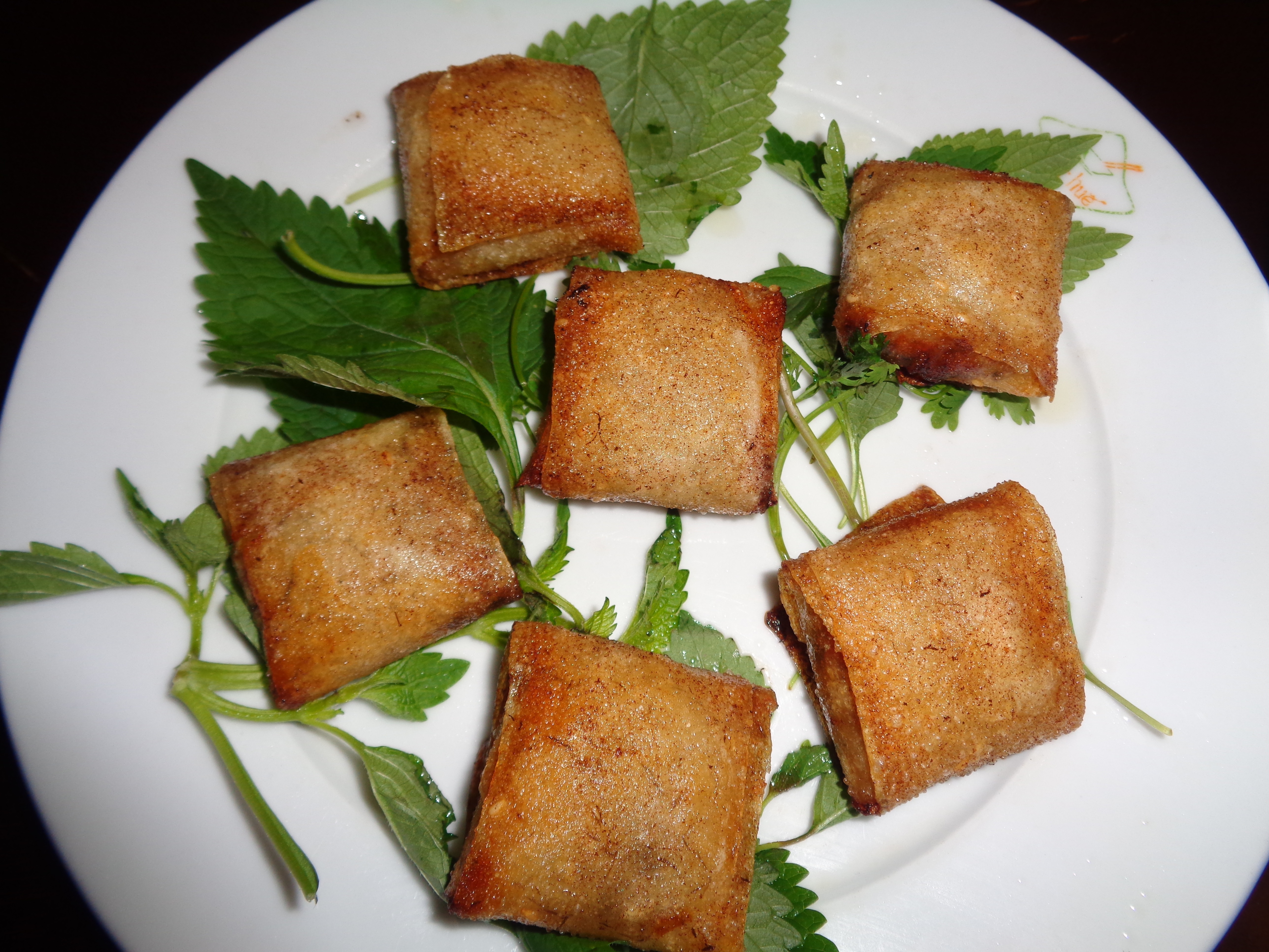 Voici 2 spécialités Vietnamiennes parmi tant d’autres qui valent vraiment le détour. C’est en visitant Hanoï que je suis tombé sur un restaurant proposant de la nourriture authentique du VietNam. Les 2 se valent énormément. Le plus étonnant des 2 est certainement Rat It Nhan Tôm (en première ligne) C’est du riz gluant, enfermant une farce aux crevettes, le tout sur galette de riz. Un délice. Quant à Ram It Hué, c’est de la feuille de riz frite, renfermant une délicieuse farce avec des épices.