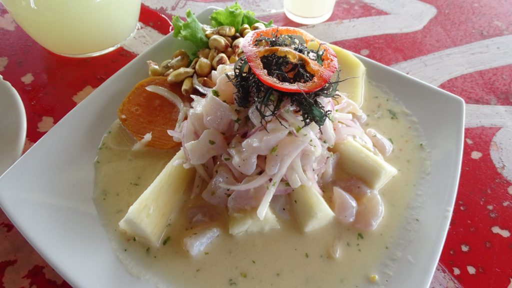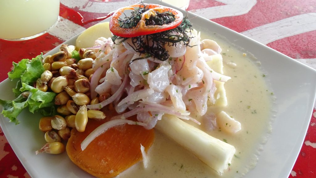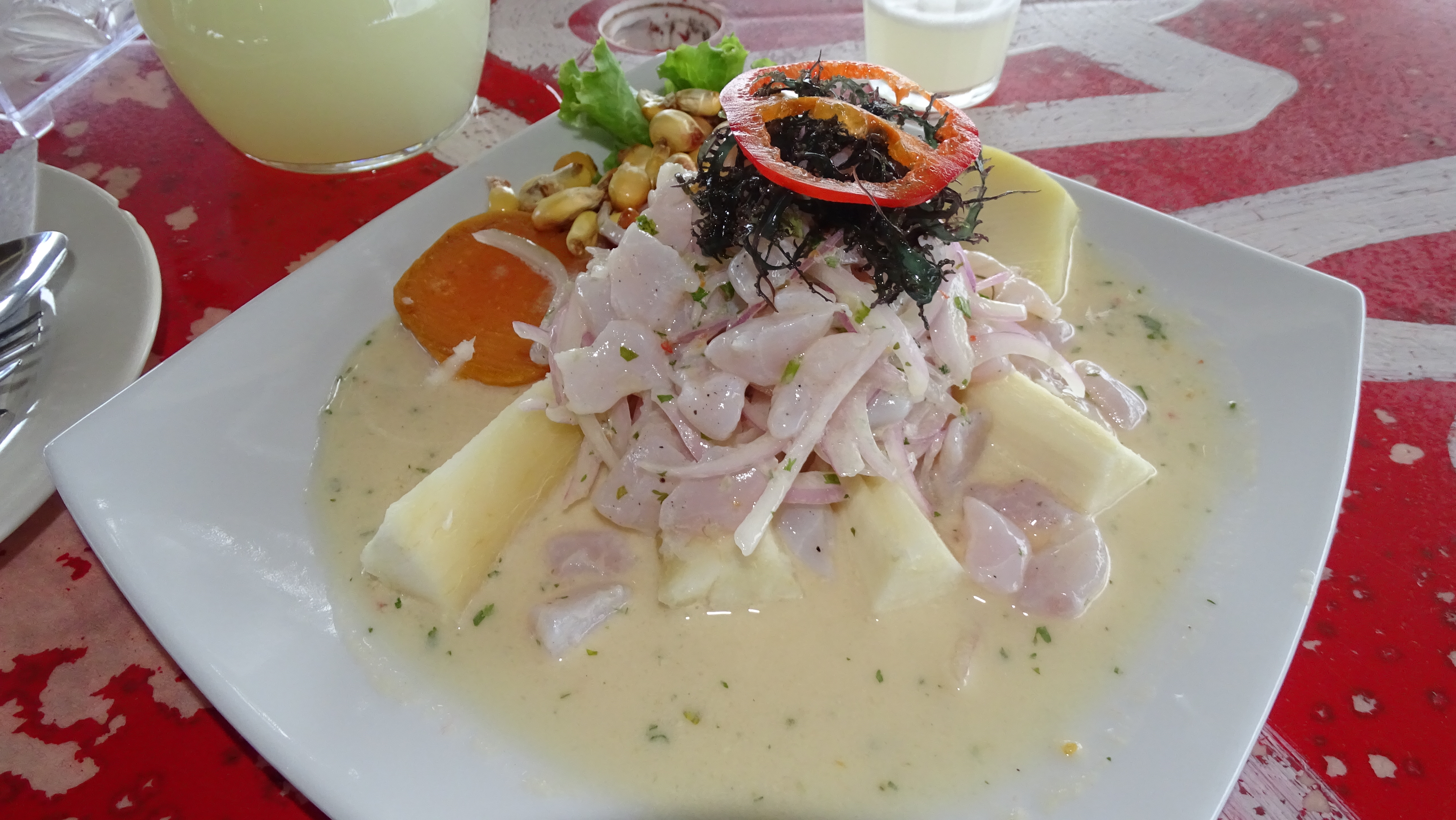 Nous sommes ici en plein cœur de l’Amazonie. On m’avait déjà parlé de la gastronomie péruvienne, avec toutes les variétés de pommes de terre que propose le pays. Toutefois, c’est en visitant l’Amazonie côté Pérou que j’ai été scotché par la délicatesse de ce plat. Prenez déjà la fraicheur de ce plat et toutes les saveurs qui vont avec. L’Arapaïma (ou Pirarucu dans l’Amazonie) est le plus gros poisson d’eau douce d’Amérique du sud, qui peut atteindre jusqu’à 4,5 m et peser 300Kg. Le céviché a pour base du poisson cru avec du jus de citron, de la coriandre et de l’oignon. Ce plat était agrémenté de piment et était servi avec de la pomme de terre, du manioc, de la patate douce, du maïs grillé et de l’algue. C’était un délice que j’avais accompagné avec une Limonada (Jus de citron pure et sucré)